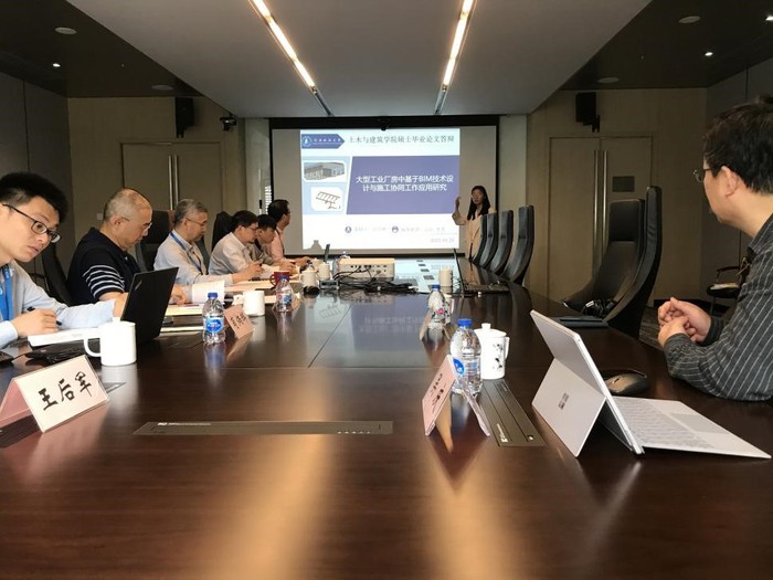bw必威西汉姆联官网土建学院积极探索构建新的科教结合、产教融合、校企合作人才培养模式,以提高人才培养质量,完善教学条件和质量保障。赵苏雅、沈娇两名同学在2019年7月至2020年6月在中船九院进行了为期一年的实习,在此期间参与了“BIM技术在***船厂中的应用”和“***厂房族定制服务”校企合作项目。研究生指导采取“双导师”制度,即企业导师和校内导师共同全程指导研究生的学位论文,经学校研究生院审批后,将学位论文答辩设在中船第九设计研究院工程有限公司,公司副总经理庄建国研究员担任答辩主席,建筑一院经理曾志坚研究员,总工程师盛健研究员,肖炳辉高工,潘欣钰高工作为答辩组员组成答辩委员会,为两名毕业生进行论文答辩,答辩的学位论文题目分别为“大型工业厂房中基于BIM技术设计与施工协同工作应用研究”和“BIM技术在***参数化建模和自动出图中的应用研究”。