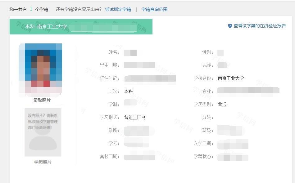 7. 进入学籍信息页面,员工须认真校对本人的姓名、学号、身份证号、照片、专业、预计毕业日期等信息,学籍状态显示为“在籍(注册学籍)”的员工即视为学籍注册成功,核实无误后直接关闭页面即可完成网上学籍信息自查。
