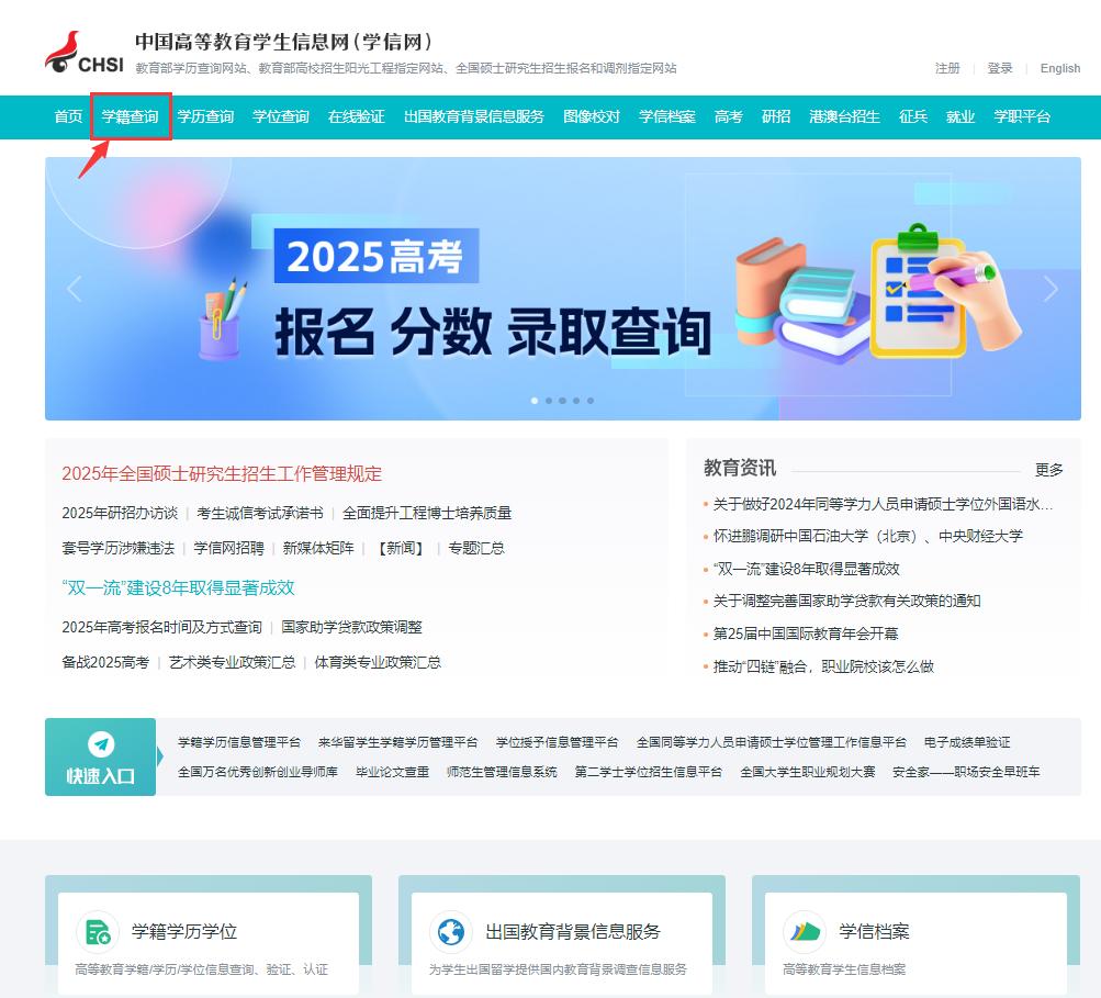 1. 员工本人登录“中国高等教育员工信息网(学信网)”,网址为:http://www.chsi.com.cn,点击主页上方“学籍查询”选项。