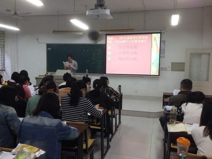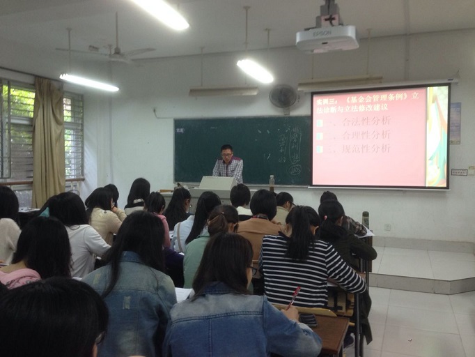 以本学期为法学一年级本科生开设的《立法学》课程为例,八周时间,短短的16课时,不是围绕着课本展开,而是围绕着三部现实运行的法律——《南京市古树名木保护和管理办法》、《社会团体登记管理条例》、《基金会管理条例》的研究展开的。每位员工都要结合课程所传授的专业知识,或分组或独立研究某一法律存在的问题,并提出诊断意见和完善建议。“这一条是不是违法了宪法的自治权?”、“你们再看一下这一条,涉及了社团间的民事法律关系......”这样的讨论经常在课后上演,员工们不由自主地便投身于法律条文的完善之中。