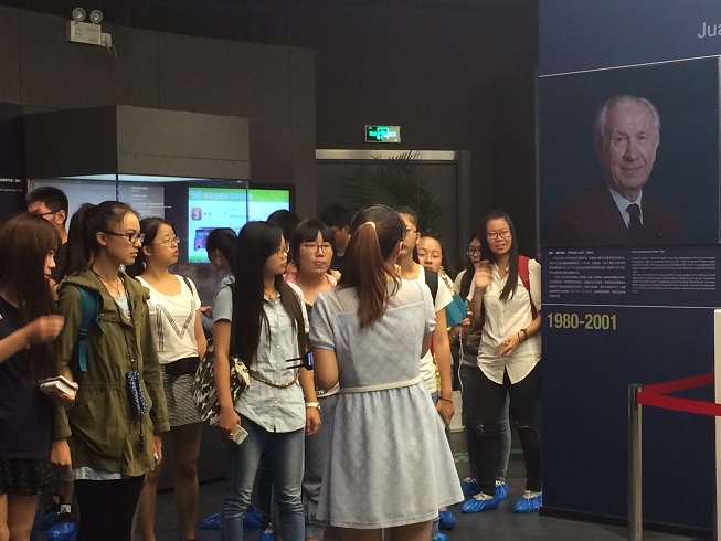 在讲解员的引导下,同学们感受着“分享青春、共筑未来”的青奥精神。博物馆入口处墙壁上摆放的是我国历届国家领导人在体育事业具有里程碑意义时刻的相片留影。跟随着讲解员往博物馆内部参观,从希腊奥运会开始到2014年南京青奥会的历届运动会火炬吸引了众多同学。每个火炬的花纹依旧清晰可见,似乎可让人真切的感受到比赛时的欢呼与汗水,以及体育那永恒的激情。大屏幕上回放着我国体育健儿们在奥运会上的精彩的激动人心的瞬间。现代奥林匹克之父顾拜旦先生的雕塑被摆放在展馆中央,吸引了众多同学的赞叹。他对体育、对世界和平做出的卓越贡献将被全世界铭记,永载史册。