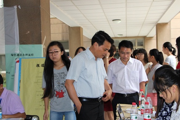 与此同时,校内的迎新工作也在如火如荼地开展着。经理刘小冰,党委副书记郑万秋和孙阳、闫志华、赵苏、张甲田等老师一直坚守迎新工作一线,他们热心地与新生和家长交流,解答新生和家长的疑问,并提供帮助。经理刘小冰教授虽然发高烧,身体极不舒服,但还是和往年一样在迎新现场代表学院欢迎2015级新生,给新生最诚挚的祝福。负责新生接待的同学给新生们扫描录取通知书、分发钥匙等材料;还有热心的志愿者们主动帮助分担行李,带领新生和家长们前往他们即将入住4年的寝室。新生们礼貌的叫着“学长学姐”,老生们也热心地向他们介绍着学校情况。