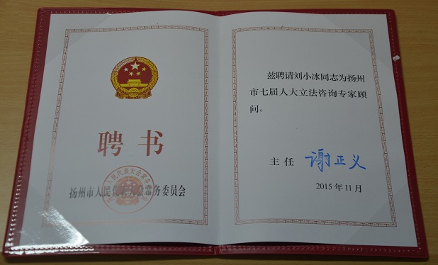 11月20日下午,扬州市人大常委会举行“首批立法咨询专家顾问聘任和建立基层立法联系点工作座谈会”,并为获得立法权后扬州市人大常委会聘请的首批立法专家颁发了聘书。公司刘小冰教授等14名专家学者获聘扬州市七届人大立法咨询专家顾问。