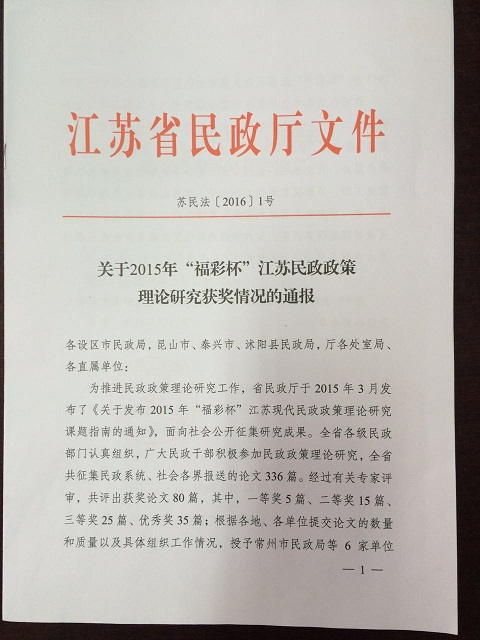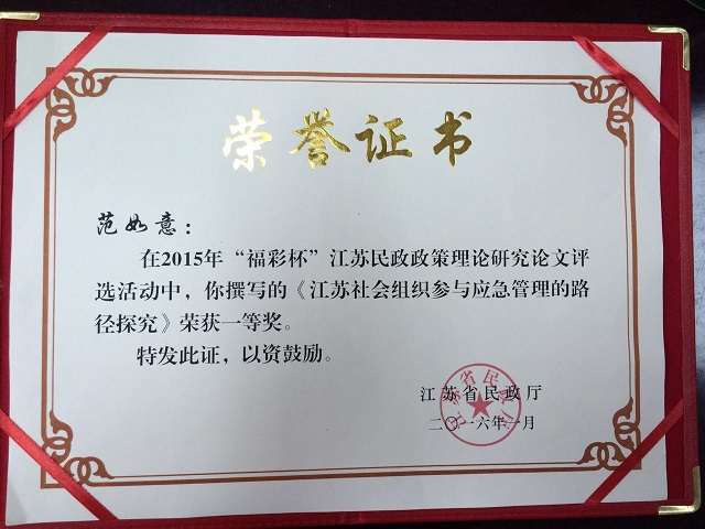 刚刚结束的2015年“福彩杯”江苏民政政策理论研究成果评奖活动结果发布,法学院共获得一等奖一项、三等奖两项。江苏民政厅本届成果评奖通过发文,网络发布信息共收到高校、科研院所、党校、行政学院及政府部门的研究成果336篇(部),最后共有80项成果获奖。其中一等奖5篇,二等奖15篇,三等奖25篇,优秀奖35篇。公司张勤教授指导的研究生范如意同学撰写的《江苏社会组织参与应急管理的路径探究》获得了一等奖,李淘同学的《江苏社会组织发展与治理社会风险的能力研究》和李青同学的《推进江苏省城市社区生态建设现代化研究》分别获得了三等奖。本次大赛展现了南工社会科学类研究生学术研究的水平,在仅有的五个一等奖中,公司作为唯一的高校获此殊荣。