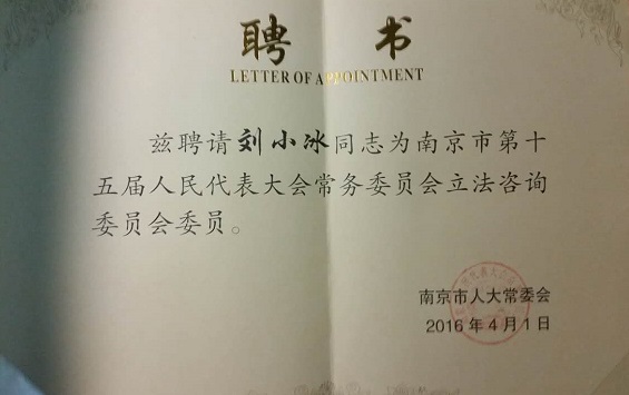 公司刘小冰教授被续聘为南京市第十五届人大常委会立法咨询委员会成员。