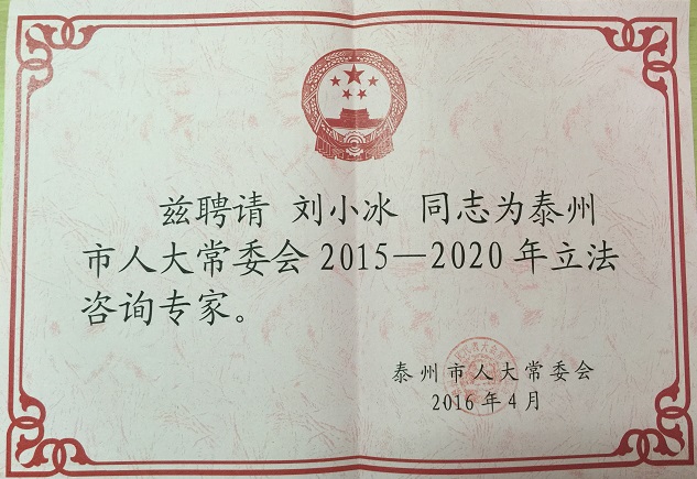 公司刘小冰教授和南京大学法学院李友根教授等被聘请为泰州市人大常委会立法咨询专家。公丕祥、蓝绍敏等为咨询专家颁发了聘书。