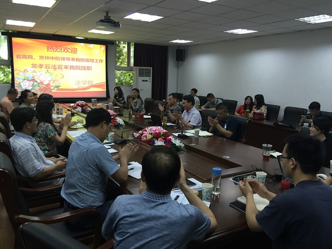 江苏省高级人民法院治部副主任陈静芳介绍了《关于实施高等学校与法律实务部门人员互聘“双千计划”的通知》的精神,同时将“双千计划”前期的典型案例向大家做了介绍,希望龙孝云法官挂职期间能多方面能促进bw必威西汉姆联官网与江苏省高级人民法院和常州市中级人民法院沟通与合作。
