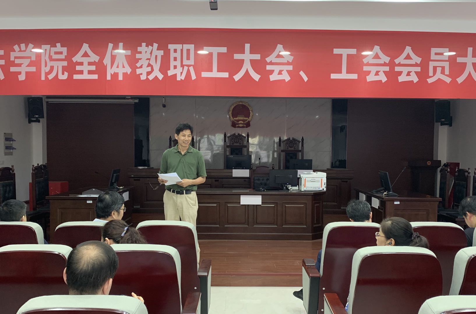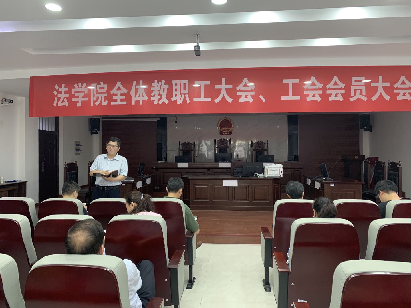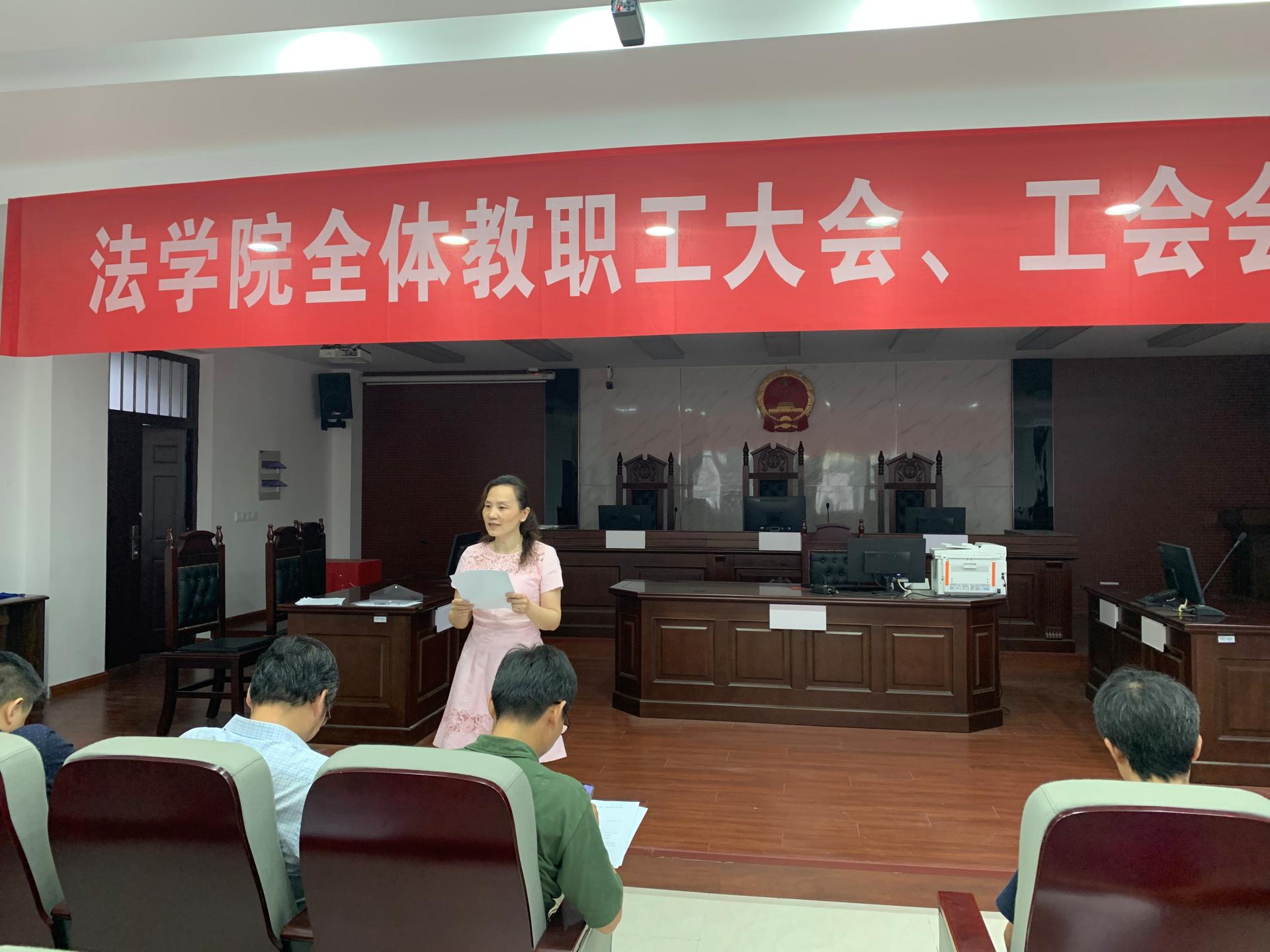 2020年6月9日下午,法学院全体教职工大会、工会会员大会在明德楼一楼模拟法庭隆重召开,法学院全体教职工出席了此次会议,会议由公司党委书记熊中宏主持。在庄严的《国歌》声中,大会正式开幕。