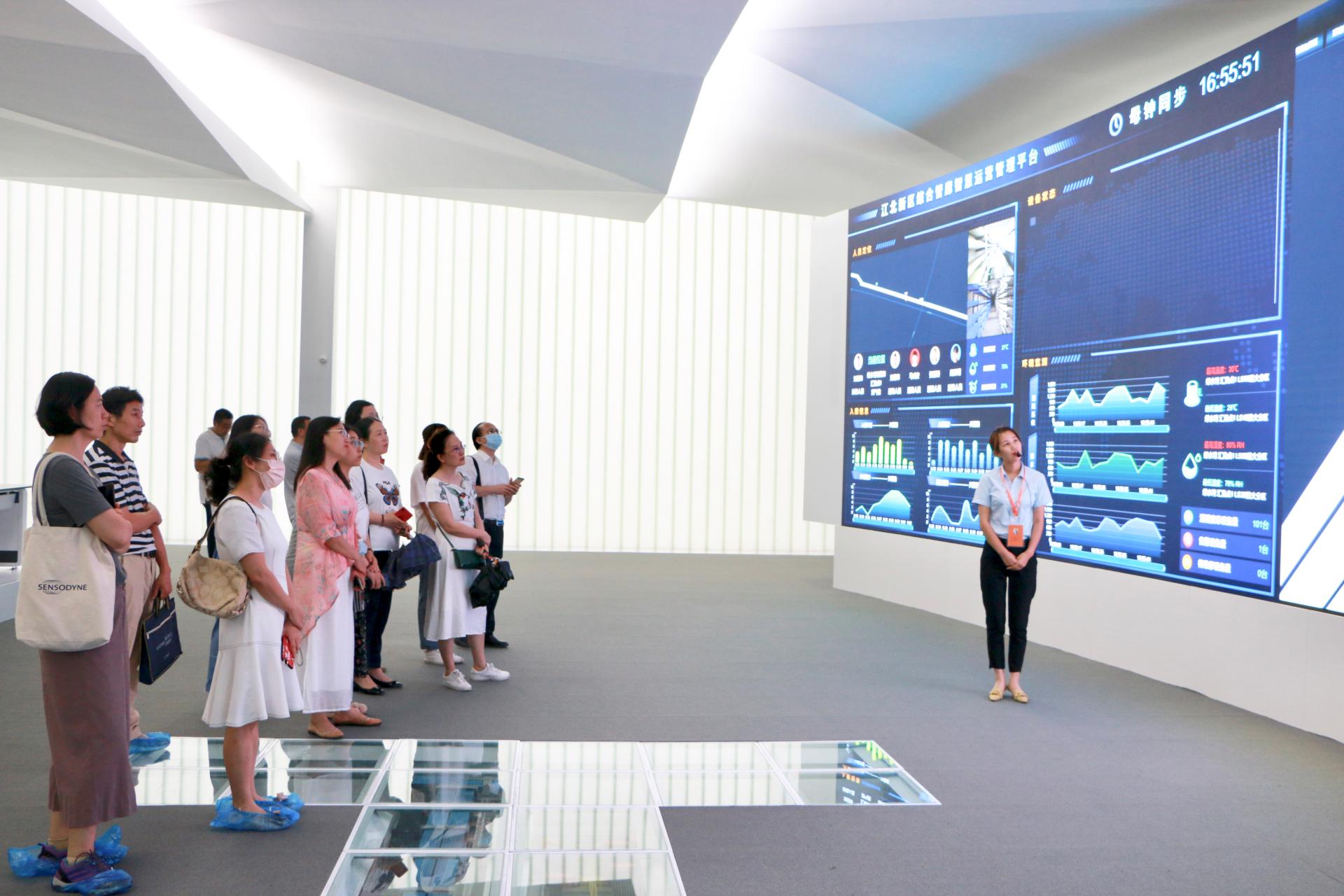 讲解员首先向大家详细介绍了地下空间项目的规划和建设情况。而后,教师们实地参观了正在建设中的地下空间项目施工现场和江北新区综合管廊二期项目。最后,大家来到江北新区地下管廊智慧化管控运维平台,实地参观智能化地下管廊监控系统。通过参观,老师们深刻感受到新区速度和大数据、人工智能等科技力量,认识到学科必须更紧密地与时代发展的脉搏相契合,这样才能更好地促进科研、人才培养和社会服务。