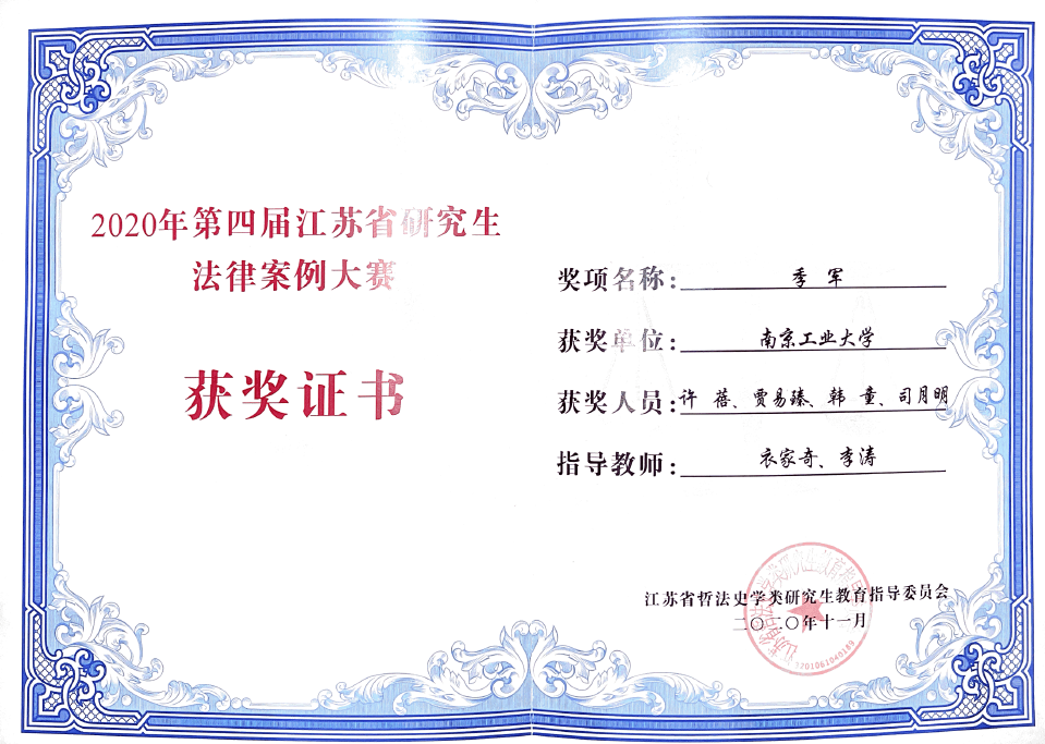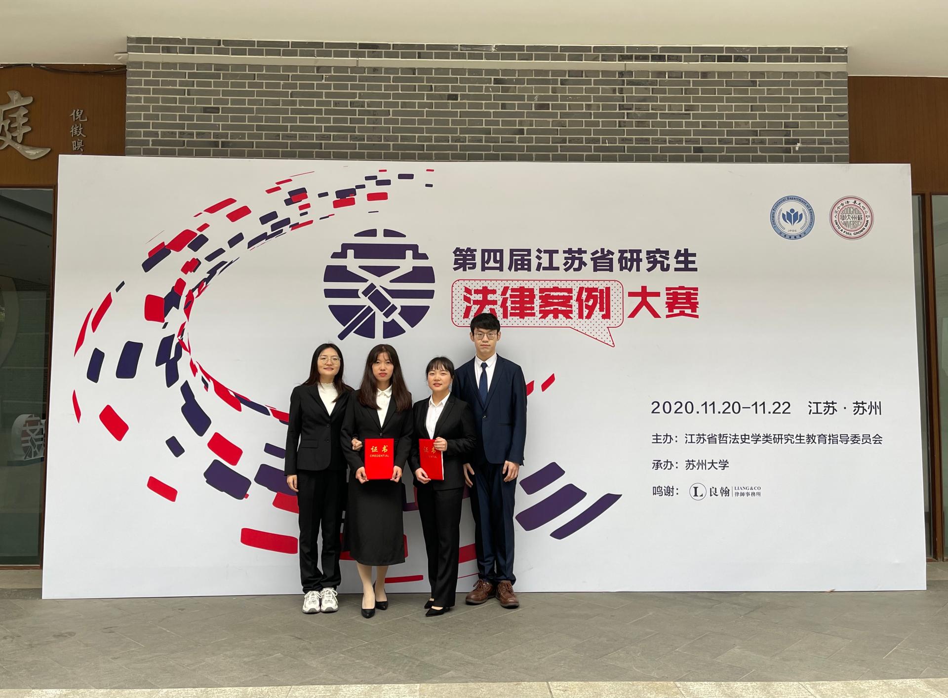 11月21日—22日,第四届江苏省研究生法律案例大赛在苏州大学王健法学院举办,东南大学、南京师范大学、江苏大学等13所高校组队参加比赛。公司法学院代表队荣获季军,法研2018级许蓓同学获得优秀辩手。江苏省哲法史学类研究生教育指导委员会秘书长朱奎泽,江苏省哲法史学类研究生教育指导委员会副主任委员、苏州大学党委常委、纪委书记芮国强等领导出席大赛闭幕式。