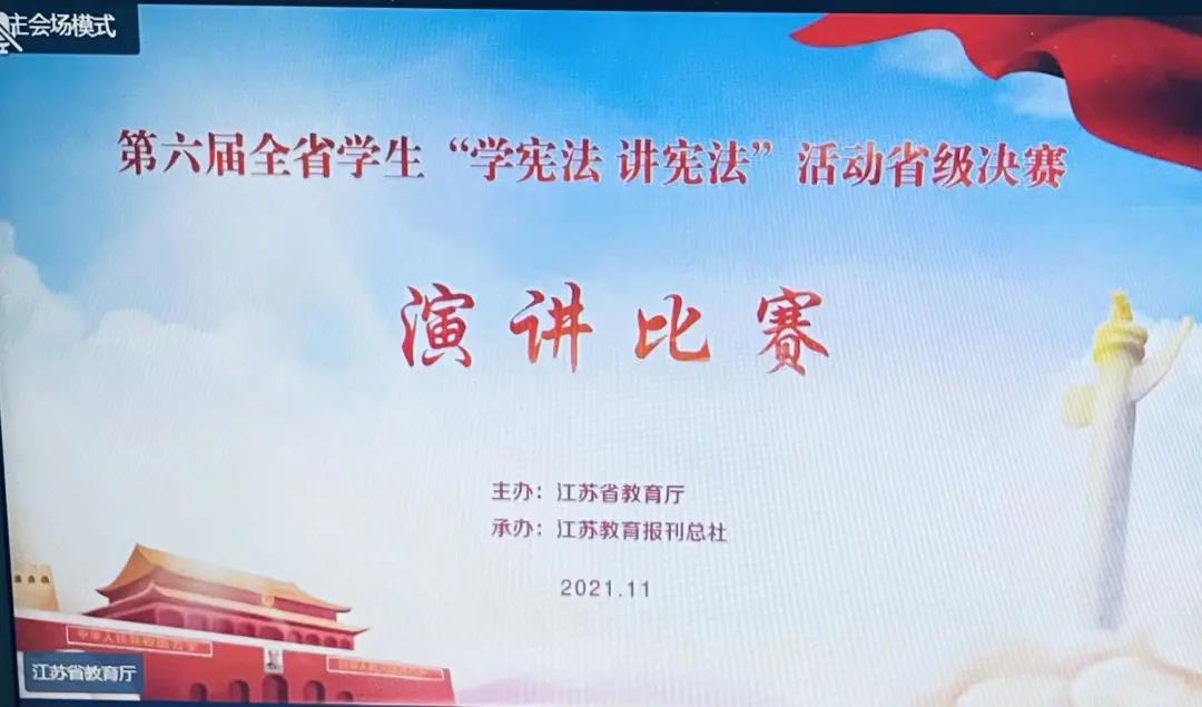 近日,由江苏省教育厅主办、江苏教育报刊总社承办的第六届全省员工“学宪法讲宪法”活动决赛通过省教育厅视频会议系统在线举行。公司法学1903班叶佳杰同学获得演讲比赛一等奖,法学1903班徐许多同学获得法治知识竞赛二等奖,张治宇老师、赖超超老师获得“优秀指导教师”。
