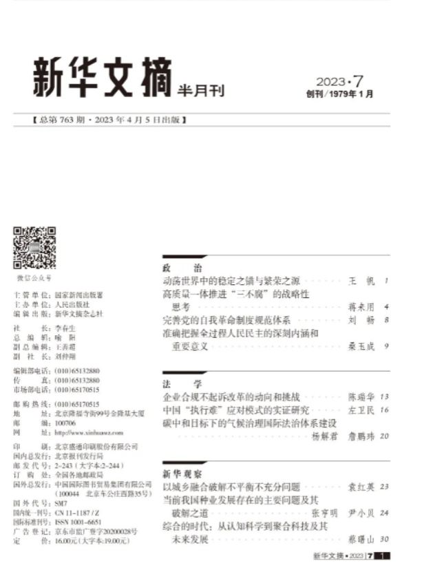 文章指出,现有的国际气候法治体系建立在《公约》《京都议定书》《巴黎协定》的框架基础上,这一体系在一定程度上推动了国际碳减排行动,但总体而言仍难以显著延缓气候变暖。一方面,不少国家碳中和专项法律的缺失使得碳中和行动落实缺乏具体依靠;另一方面,现有遵约机制下,《巴黎协定》规定的共同但有区别责任原则、绿色基金机制、技术支持机制以及国家自主贡献机制难以落到实处。对此,我国应发挥大国作用,制定气候治理与碳中和法律,以公约机制与公约外机制共同落实气候行动义务,并督促发达国家履行国际减排义务,从而助力我国和全球碳中和目标的实现。据悉,这是杨解君教授近三年第二篇被《新华文摘》全文转载的“双碳”法治研究领域的论文。