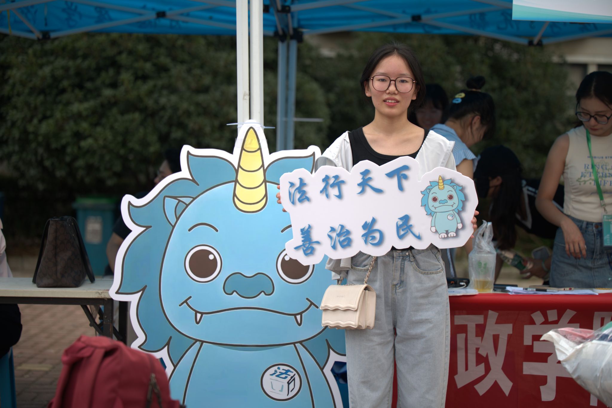 迎新现场,创意纷呈。学院突出专业特色,在各个报到点都设立了迎新标语,专门定制了吉祥物“法小豸”立牌伫立于迎新接待点前,吸引了过往师生纷纷打卡留念。