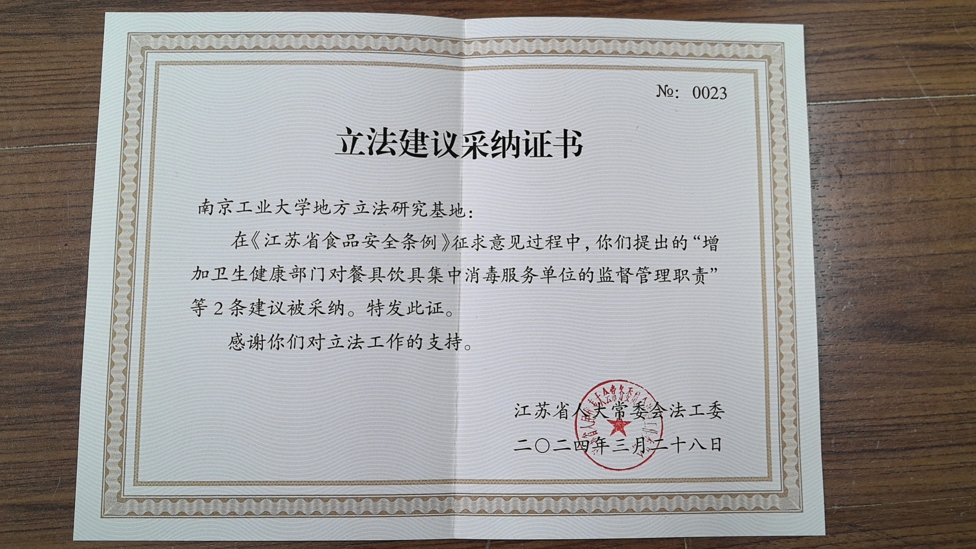 近日,公司江苏省地方立法研究基地针对《江苏省食品安全条例》的两条立法建议被省人大常委会采纳,省人大常委会法工委为基地颁发立法建议采纳证书。今年以来,公司该研究基地已有四条立法建议获得省人大常委会采纳。