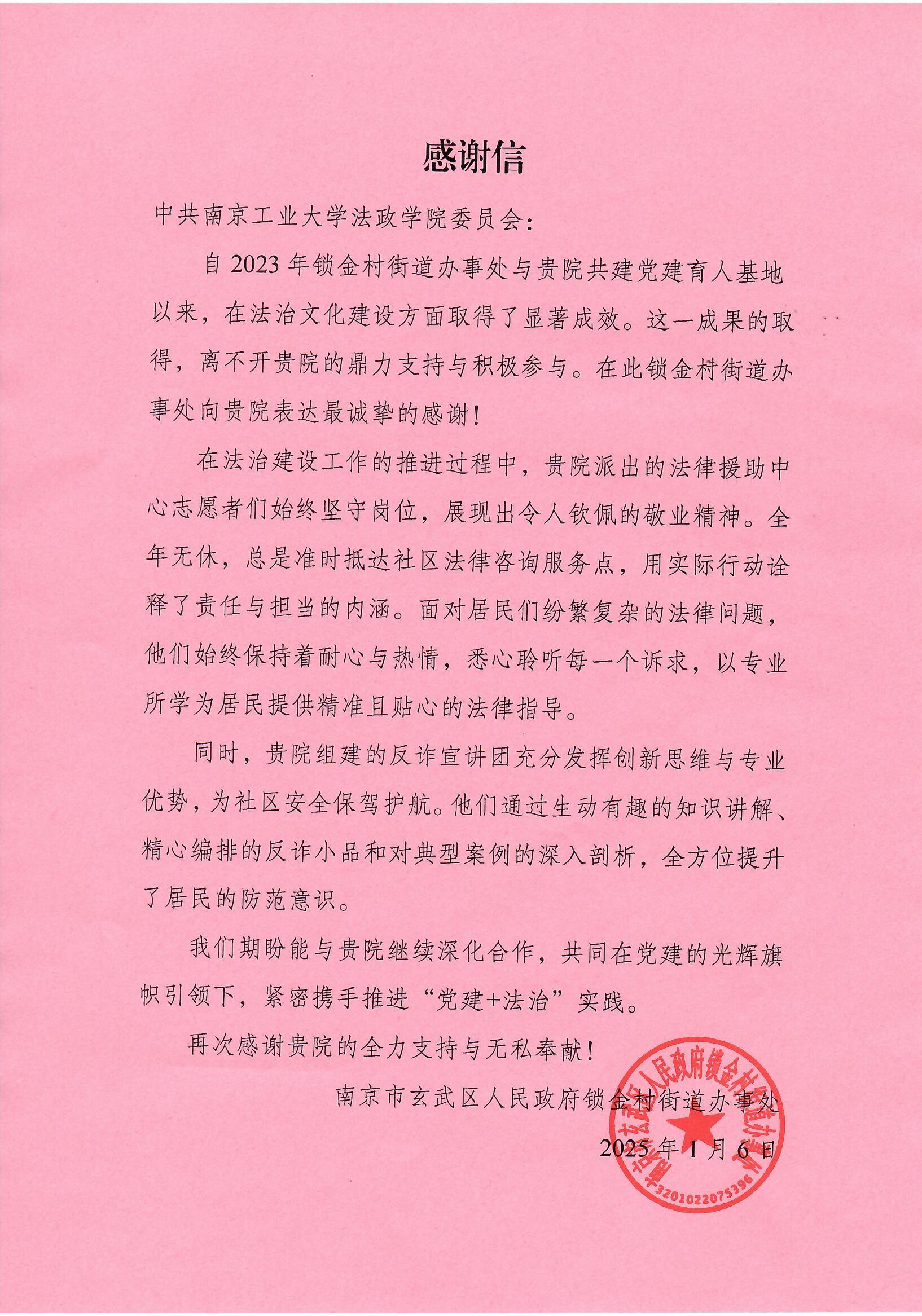 1月6日,南京市玄武区人民政府锁金街道办事处向公司党委发来感谢信,感谢bw必威西汉姆联官网在双方共建党建育人基地、推进锁金村街道法治文化建设方面提供的支持,并充分肯定了学院派出的法律援助中心志愿者们坚守岗位、全年无休的敬业精神。