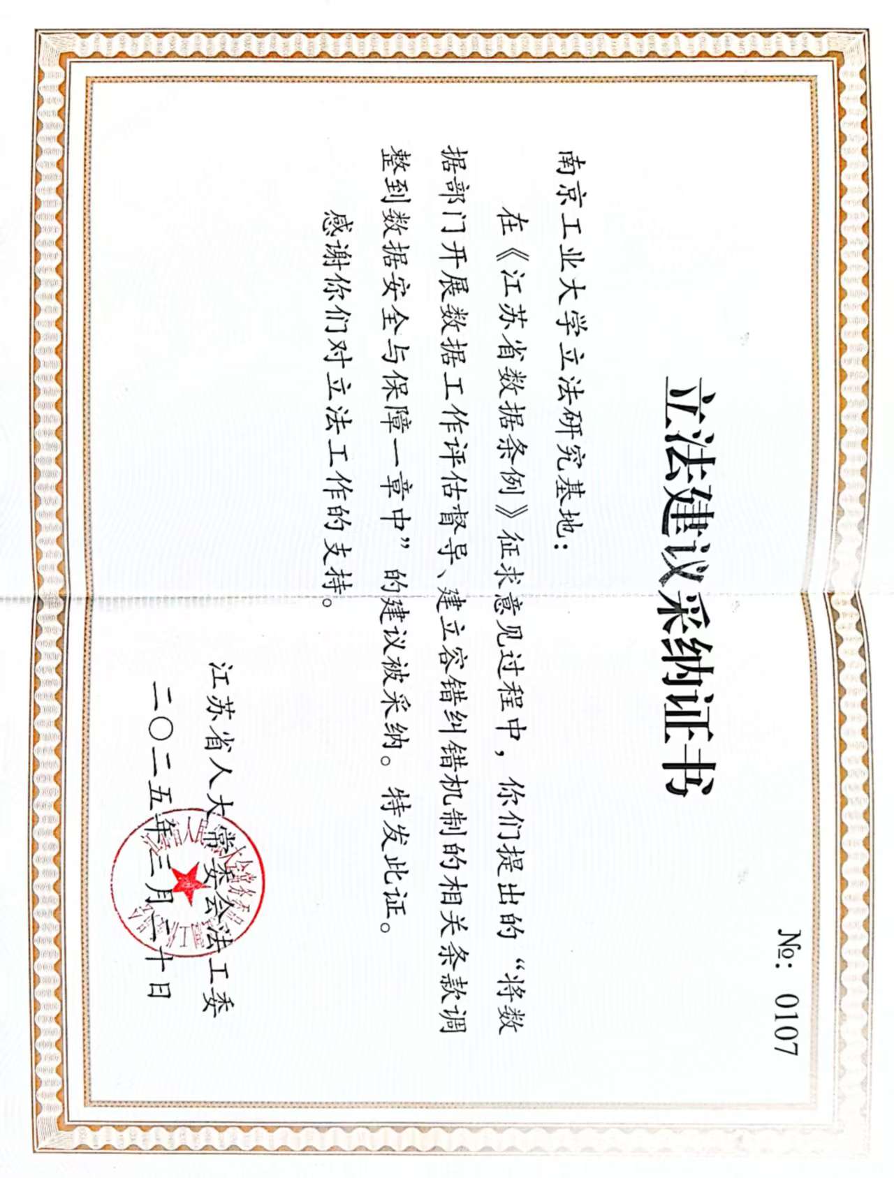 近日,公司江苏省地方立法研究基地针对《江苏省数据条例》的立法建议获省人大常委会采纳,省人大常委会法工委为基地颁发立法建议采纳证书。该条例是江苏首部数据领域基础性法规,是“数据二十条”颁布后全国首个省级数据立法。