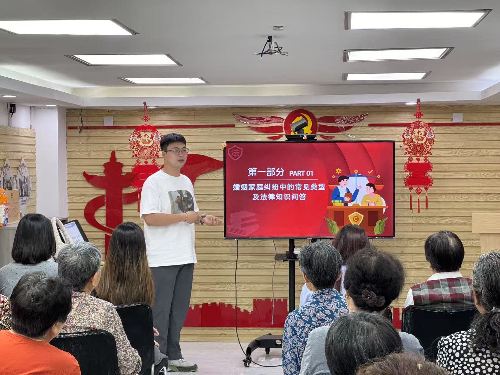 活动现场,宣讲团成员徐梓尧、朱业诚两位同学立足社区实际,围绕《民法典》婚姻家庭编与继承编核心内容展开宣讲。徐梓尧同学采用“以案释法”模式,结合近年来审理的典型案例,系统梳理了婚姻效力认定、夫妻共同财产分割、子女抚养权归属等法律要点。朱业诚同学聚焦遗产继承领域,深入浅出阐释了法定继承顺序、遗嘱效力认定、遗产管理人制度等重点条款。活动最后还设置了互动问答环节,进一步帮助居民们厘清法律认知误区,识别常见的诈骗类型,掌握依法维权路径,获得了居民一致好评。