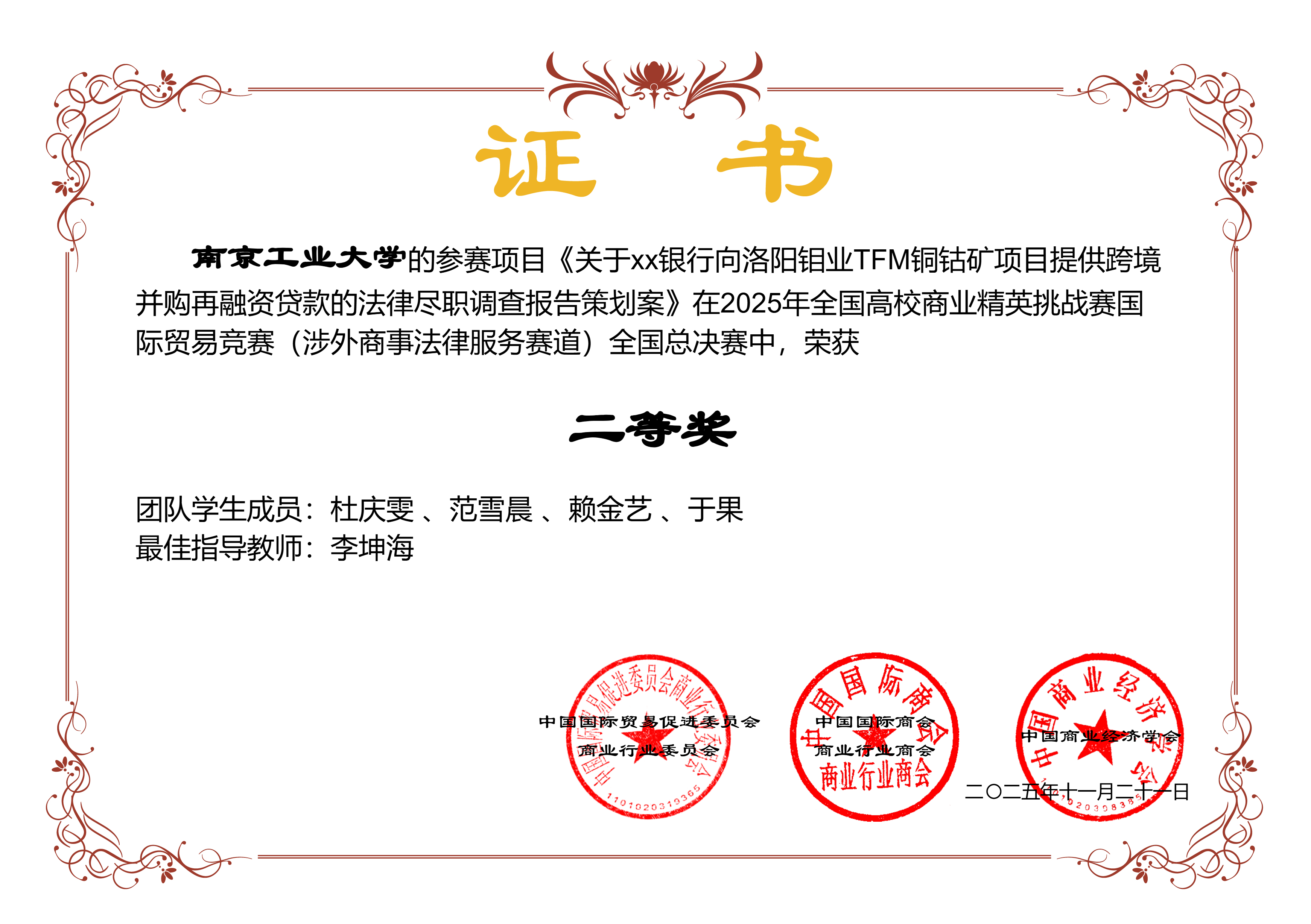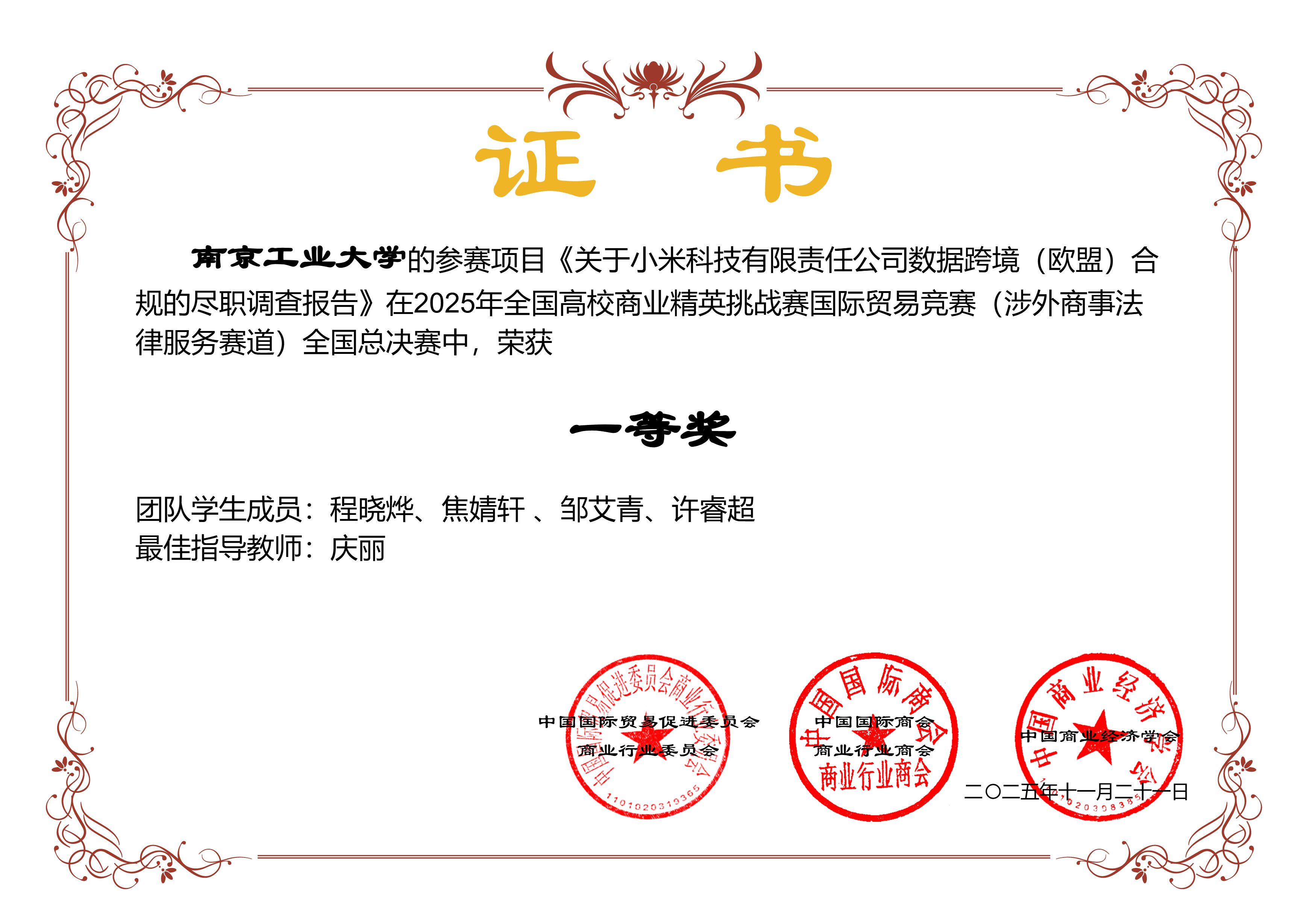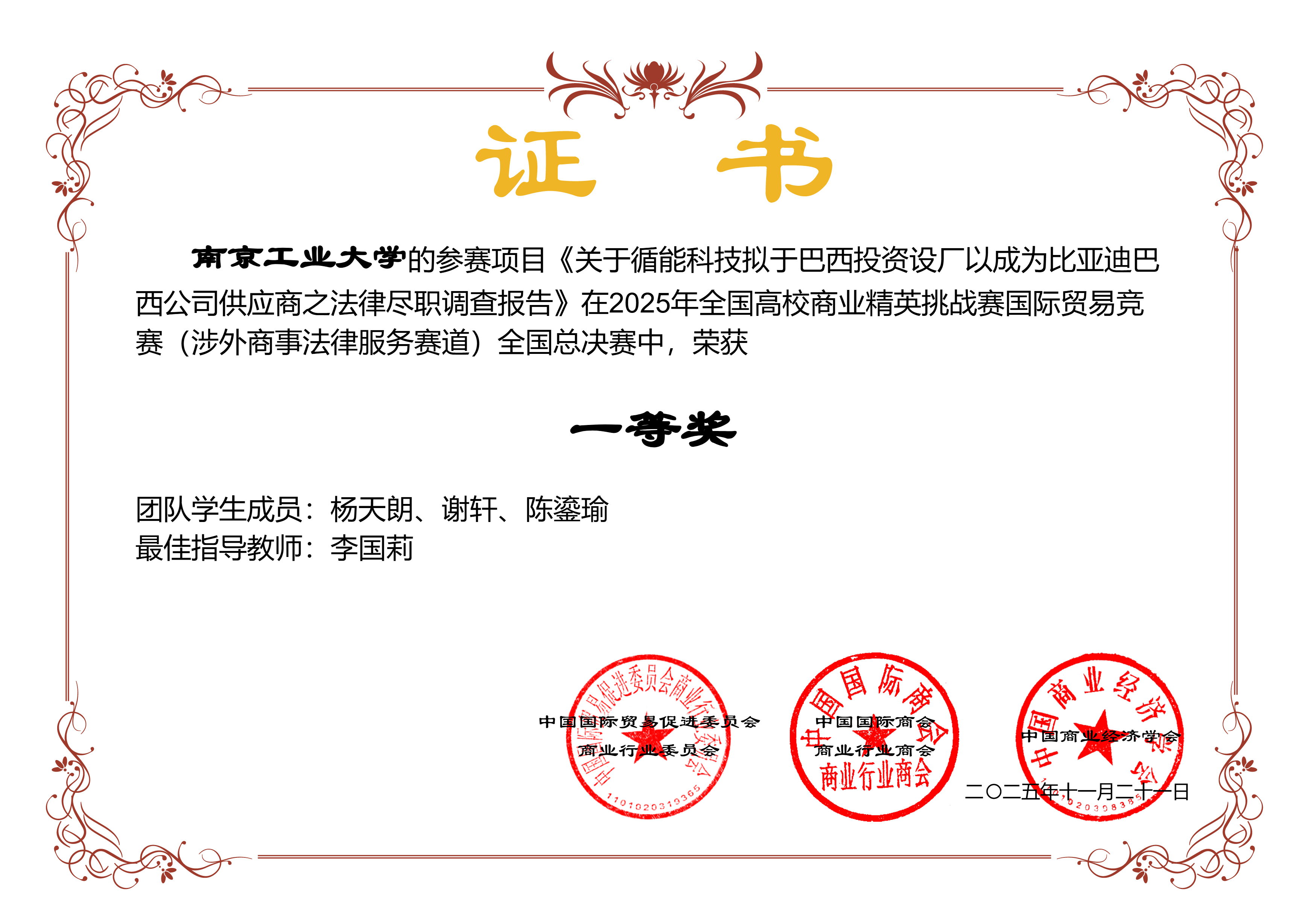 近日,由中国国际贸易促进委员会商业行业委员会牵头主办的2025年全国高校商业精英挑战赛国际贸易竞赛全国总决赛落幕。bw必威西汉姆联官网学子在涉外商事法律服务赛中发挥出色,共斩获全国一等奖两项、二等奖一项,学校获得“最佳院校组织奖”。