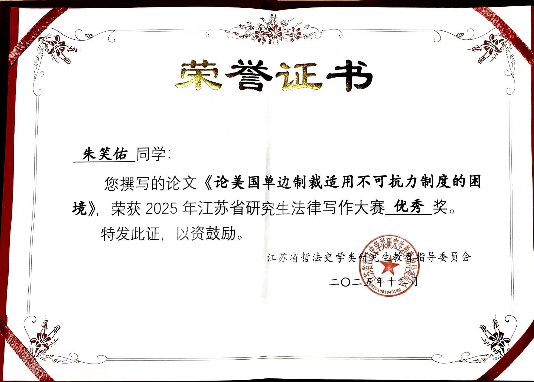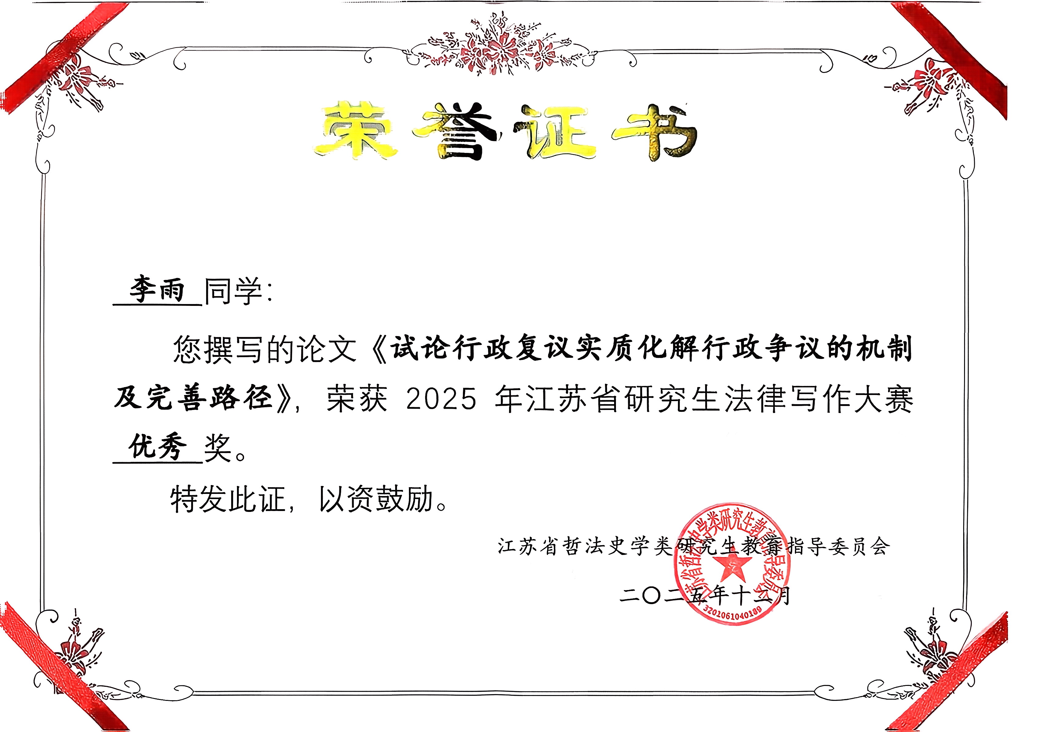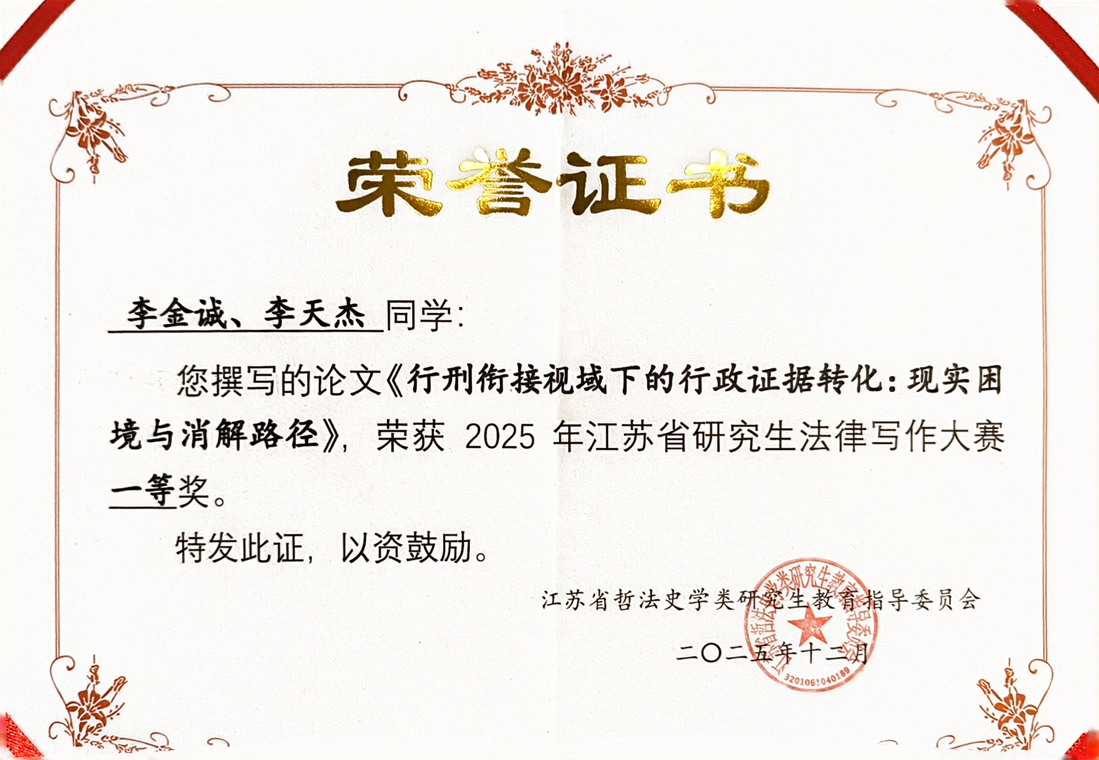 bw必威西汉姆联官网研究生在此次大赛中表现优异,共4篇作品进入决赛。其中,李金诚、李天杰两位同学合作的论文《行刑衔接视域下的行政证据转化:现实困境与消解路径》凭借其深入的研究视角和严谨的论证逻辑,荣获一等奖;徐紫瑶同学的论文《轻罪治理背景下附条件不起诉制度研究》荣获三等奖。此外,李雨同学的《试论行政复议实质化解行政争议的机制及完善路径》、朱笑佑同学的《论美国单边制裁适用不可抗力制度的困境》两篇论文获得优秀奖。