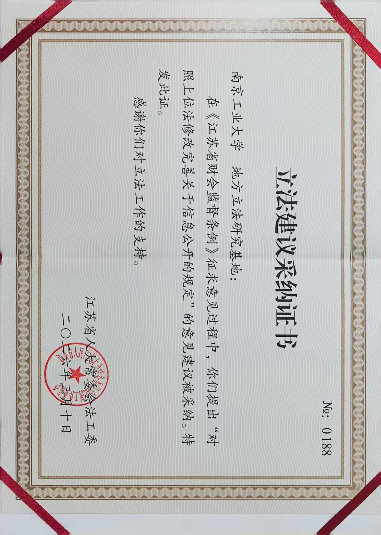近日,公司江苏省地方立法研究基地针对《江苏省财会监督条例》的立法建议获省人大常委会采纳,省人大常委会法工委为基地颁发立法建议采纳证书。该条例被列入江苏省政府2026年立法工作计划,是全国率先专门制定的财会监督地方性法规。