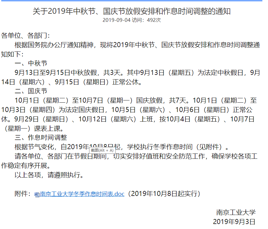 关于2019年中秋节、国庆节放假安排和作息时间调整的通知