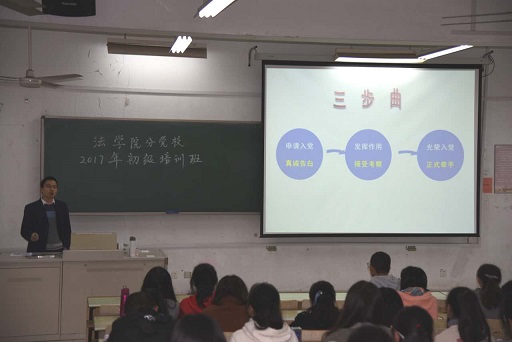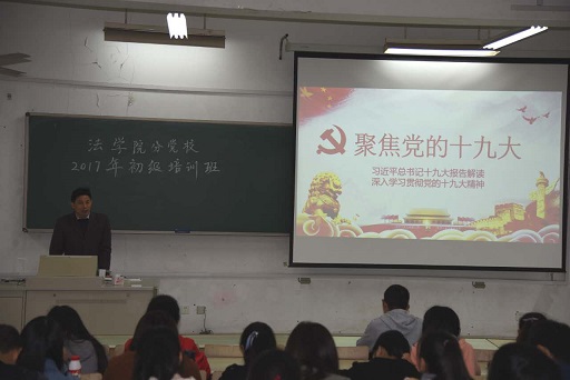 为深入学习贯彻党的十九大精神,完善发展员工党员培训体系,11月12日法学院分党校在仁智315开展2017年初级党校培训。法公司党委书记熊中宏、副书记朱忠祥、辅导员檀芬老师为递交入党申请书的2017级本科生、研究生主讲了三场入党启蒙教育。