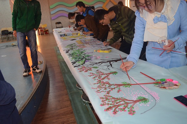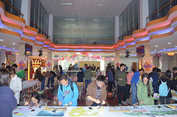 伴着舒缓的音乐声,一幅巨大的画卷缓缓拉开,宣告着第十三届“百米画卷”书画大赛的开始。简单的准备工作就绪,选手们分别来到画卷的合适位置展开创作。他们个个身怀绝技,各有所长,用自己手中的画笔诠释着南工学子对母校的挚爱。色彩丰富的水粉画,表现力强,是选手们最普遍应用的表现形式。同学们以独特的视角描绘的校园一角,富有生活气息,拉近了作品与观众之间的距离;几位选手合力打造的七彩霓虹格外夺人眼球。选手们的创作风格也不尽相同。既有出淤泥而不染的莲花摇曳婀娜姿态,也有缥缈虚幻的梦境尽显浪漫神秘,引起人无限遐想。素描对绘画技术功底要求很高,但是难不倒我们心灵手巧的选手们,他们创作的素描画栩栩如生,丝毫不逊色于色彩画,路过的观众都忍不住称赞一番。在这篇青春的画卷上,同学们的想象力、创造力也得到了极大的展现。一位选手奇思妙想,现场创作了一幅二维码的图案为自己代言,富于时代气息;还有一位选手临摹的埃菲尔铁塔,气势非凡,直插云霄,给人留下了极为深刻的印象。