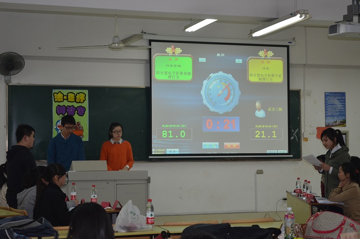 本次比赛分为两场进行。上半场比赛是行政管理专业对战法学专业,论题为即开型电子彩票是否为赌博行为;下半场是公管专业和社工专业展开的激战,论题为伴侣应该选择我爱的人还是爱我的人。在主持人的宣布下,每个小组展开了激烈的角逐。比赛共分初赛、复赛、决赛三部分,在初赛阶段,赛场气氛紧张热烈,双方辩手你来我往、侃侃而谈,场下观众激情澎湃、掌声连连响起。复赛阶段,各晋级队伍旁征博引,相互间进行了激烈的交锋,观赛员工热情参与,互动环节更是将现场气氛活跃起来。在最扣人心弦的决赛阶段,参赛队伍乘风破浪,气势如虹,自由辩论环节将比赛气氛再次推向高潮,现场气氛迅速升温,精彩不停,掌声不断。最后,经过4场激烈的比赛和评委们公正的评判,法学专业辩论队和公管专业辩论队分别获得了比赛的胜利,法学1201班余芸和公管1201班朱炽诚分获“最佳辩手”称号。