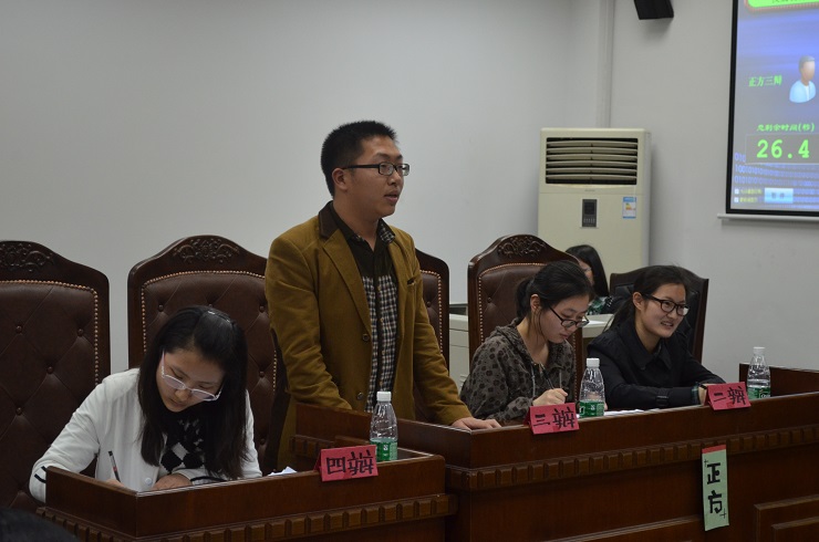 比赛还未开始,赛场内就聚集了众多的同学,都期待着这场智慧与口才激烈碰撞的精彩比赛。此次比赛由来自广播台的孔令芝担任整场辩论赛的主席,并且邀请了众多校辩论队的资深辩手担任评委,如理学院辩论队队长卞广路,土木学院辩论队队长张石雨,法政院辩论队现任教练耿志超等。经过前两周的激烈角逐,两支队伍脱颖而出进入了今天的决赛,他们分别是法学1302班和法学1201班。本次比赛的辩题是“在当今中国高薪养廉是否是反腐良方”。法学1302班作为正方,法学1201班作为反方正式展开了热烈的辩论。正方虽然在辩论立场上处在劣势地位,但这也并没有影响他们的发挥,在第一环节,正方一辩提出的三大论点环环相扣,得到了评委与观众的一致好评。他们认为在当今中国高薪养廉政策是反腐良方:第一,高薪可以满足官员低层次的物质需求,解决后顾之忧;第二,高薪会增加行贿成本,抑制行贿;第三高薪可以吸引更多高素质毕业生,提高官员整体素质.而反方一辩提出的三大辩论观点同样也十分精彩。比赛由此愈演愈烈,在其后的攻辩环节和自由辩论环节比赛更一度进入白热化阶段。尤其是自由辩论环节,双方快节奏的问答与口才及应变能力的交锋使场下的观众一度拍手叫好。在总结陈词之后,紧接着的是观众提问环节,场下观众席犀利、新颖的提问使得比赛又掀起了一阵新高潮。评委最后都上台进行了点评与投票,虽然两队都发挥出色,但最终反方法学1201班以其今晚出色的发挥获得了优胜,赢得了本届法正杯辩论赛的冠军。而正方法学1302班的谢艳艳同学则在本次辩论赛中获得了“最佳辩手”称号。比赛在欢乐的颁奖典礼之后进入了尾声。