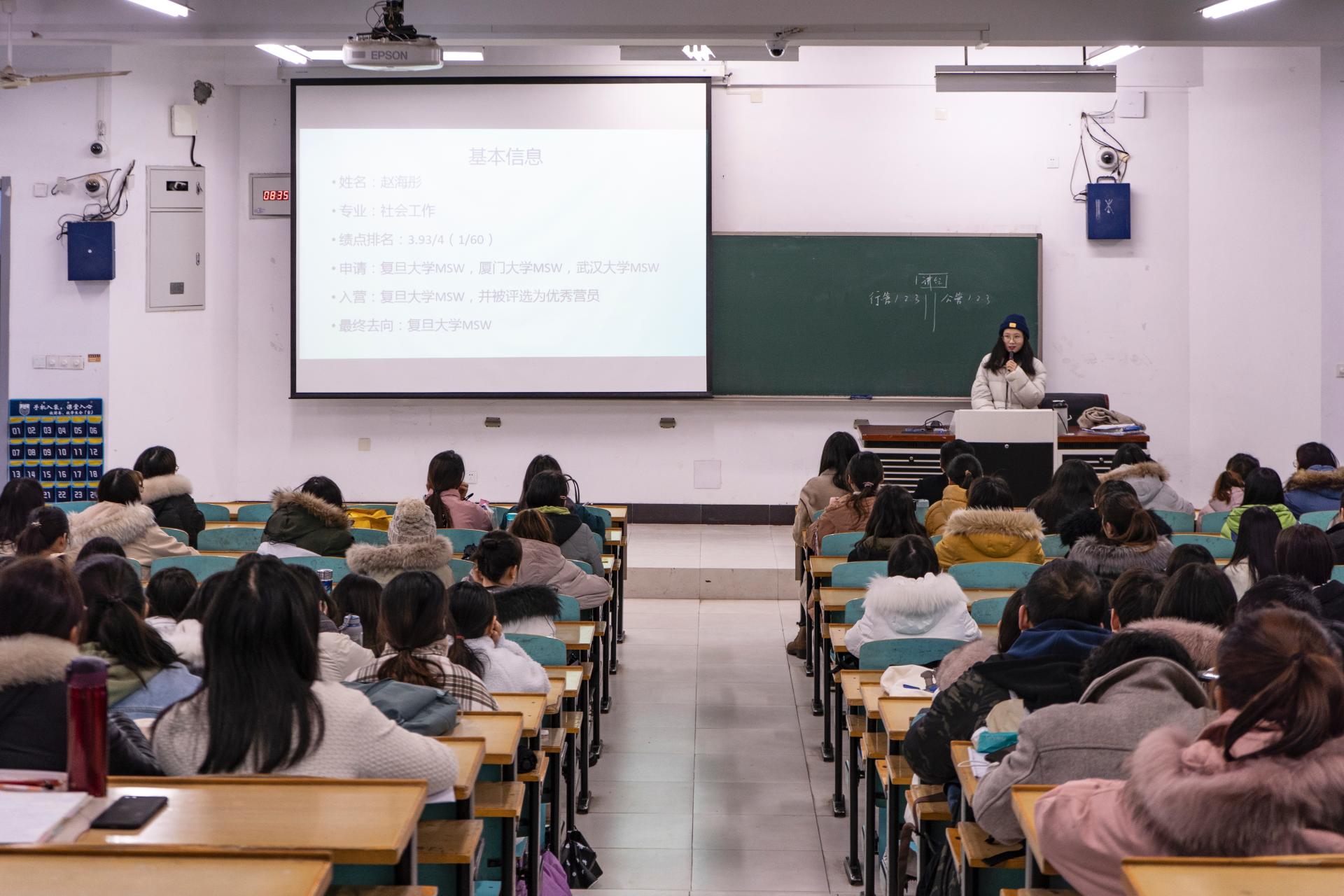 行研19级王玲、伍清同学详细讲解了本校考研的备考经验,包括各科的复习方法、个人信心的树立、考研计划、生活饮食习惯、作息时间安排等方面的一些心得。行研19级崔向洁同学从目标院校与目标专业的选择、资料搜集、备考过程、考试过程四个方面介绍了她的考研经验,让在座的观众对考研流程、环节有了全面的认识和了解。行研19级颜鹏同学作为跨专业考研的代表分享了自己学习技巧和秘诀。社会1601班赵海彤同学分享了她成功保研复旦大学的经历,绩点专业第一、竞赛成果丰硕、科研水平突出,她用自身经历阐释了“学海无涯苦做舟”、“功在平时”,启示在座的员工们珍惜大学四年时光,只有坚持每时每刻不放松,才能在关键时刻脱颖而出。