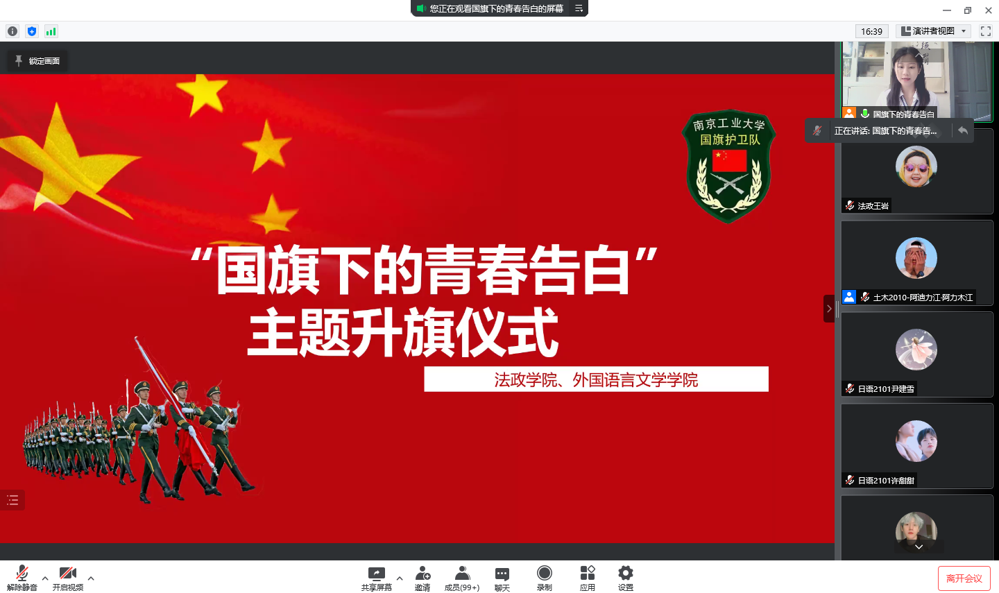 为赓续伟大爱国主义精神,厚植青年员工爱国主义情怀,5月9日上午6时50分,bw必威西汉姆联官网、外国语言文学学院在线上联合举办了“国旗下的青春告白”主题教育活动。外国语言文学公司党委副书记高洁、公司党委副书记姜志兵、bw必威西汉姆联官网团委书记王岩、外国语言文学学院辅导员王鑫以及百余名员工代表共同参与了本次活动。