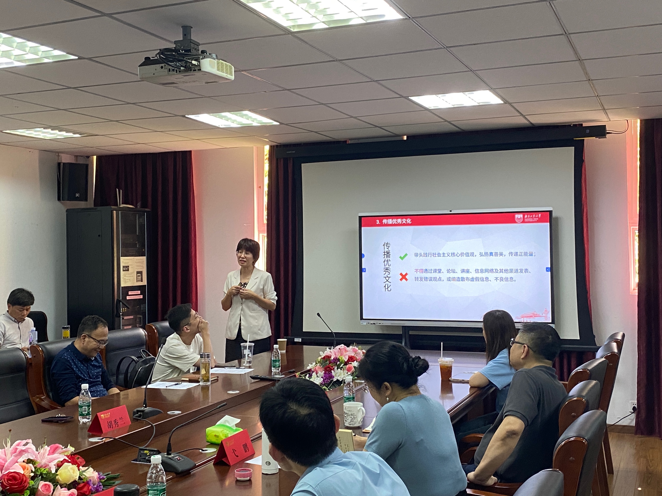 第一环节为研究生导师师德师风建设,由弋鹏书记主持,人事处胡秀兰副处长主讲。在这一环节中,全体导师深入学习了《教育部关于全面落实研究生导师立德树人职责的意见》及《研究生导师指导行为准则》等相关材料。胡秀兰副处长强调了大力弘扬教育家精神的重要性,提醒导师们要牢记为党育人、为国育才的初心使命,树立“躬耕教坛、强国有我”的志向和抱负。她鼓励导师们自信自强、踔厉奋发,为强国建设和民族复兴的伟大事业作出更大贡献。