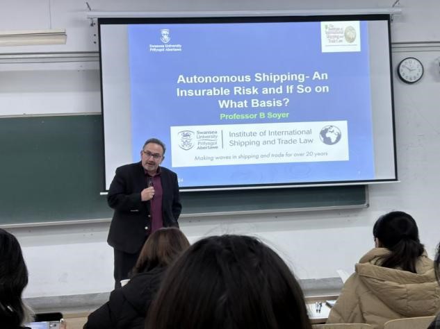 讲座中,Baris Soyer 教授详细剖析了海商法在当代航运业面临的新挑战与新机遇,特别针对无人驾驶船的出现给海事保险带来的冲击与变革进行了深入解读。他阐述了无人驾驶船在技术特性、法律责任界定等方面的独特之处,通过生动的案例分析和通俗易懂的讲解方式,将复杂的法律与保险问题清晰呈现,引发了在场师生对其保险可行性与适配险种的深入思考。