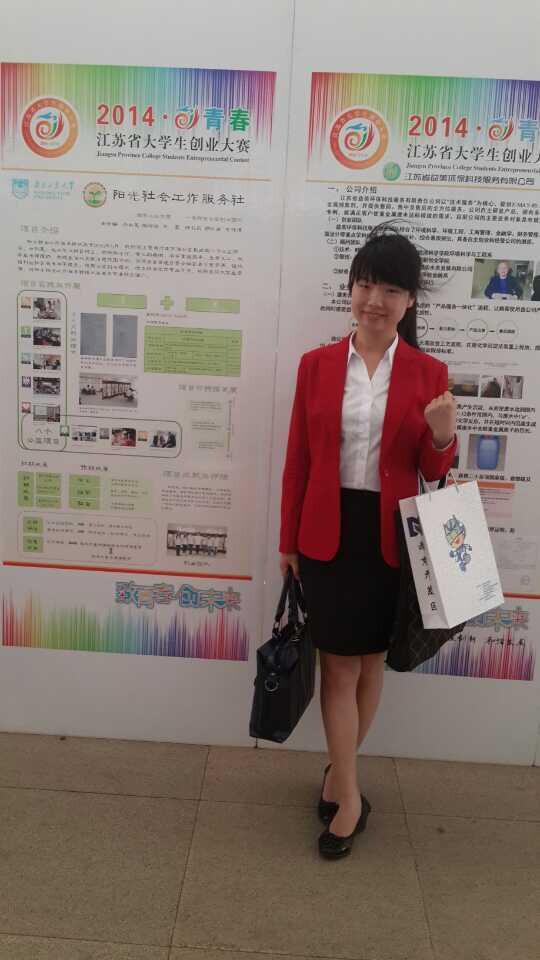 周亦姗, 社会1101班,团支书、院员工会副主席。积极参加实践活动,获暑期实践先进个人、亚青明星志愿者、校优秀员工会干部等称号。申报的特殊青少年社区矫正的项目获公司首个被市民政局资助的项目。负责专业实践项目入选江苏省老员工创新实践指导项目,南京浦口微公益项目等。代表公司首次参加全国老员工创业比赛,荣获江苏省铜奖的佳绩。